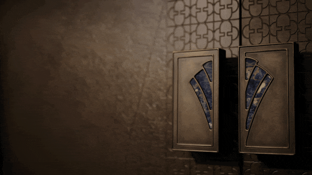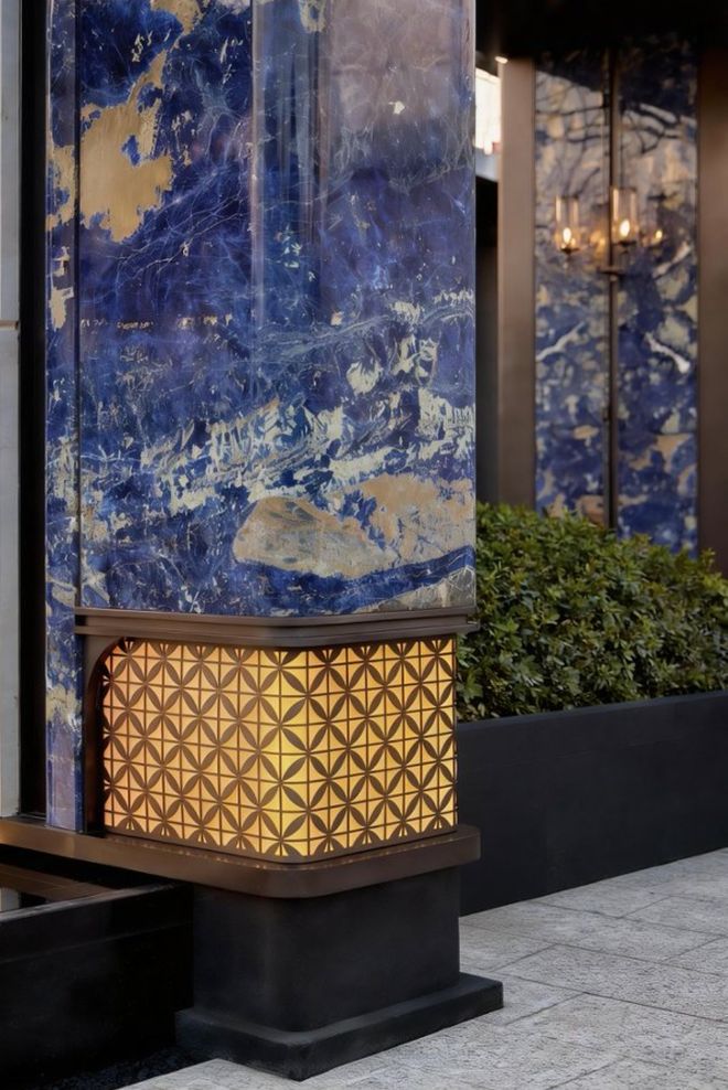 另一方面,大门一冲眼,整面来自保加利亚的维纳多石材,两侧使用顶级奢石景泰蓝的撞色处理,蓝白交织,奢华感扑面而来。