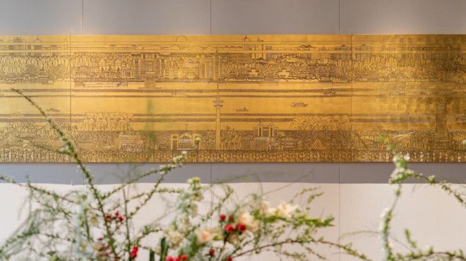 比如,南通书法国画研究院院长侯德剑与邵连先生的漆画《盛世南通,和兴福祉》坐镇山水会客厅,以长卷笔触勾勒江城盛景。