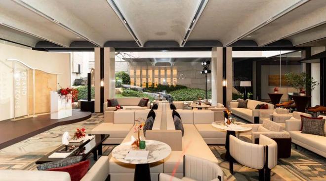 社交中庭内半开放式行政酒廊,借力下沉式庭院的通透界面,最大化引入自然光线,让地下空间告别阴暗压抑,呈现出明亮舒适、惬意放松的氛围。