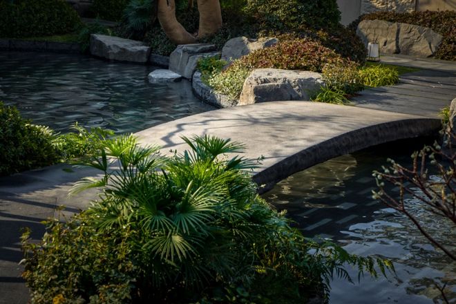 周边的太行金景观石的大小、颜色、角度,都按照场地需求精调推敲,尽量降低人工痕迹,也是因此,它保留着大自然的本真,仿佛将太行山的林溪都搬入了园中。